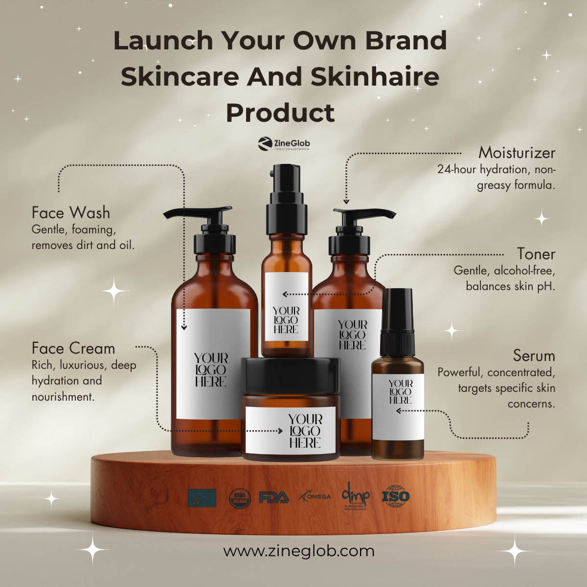 With Zineglob, you can develop your own cosmetic brand line quickly and easily — whether you’re starting a new business or expanding your current product range.
