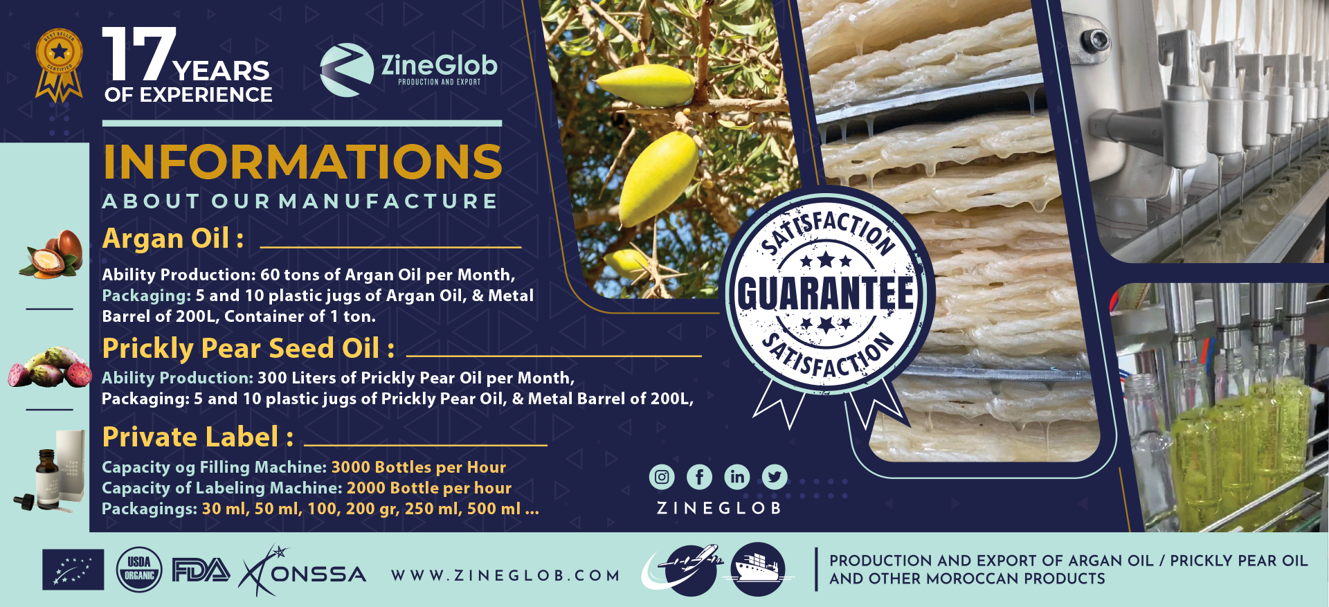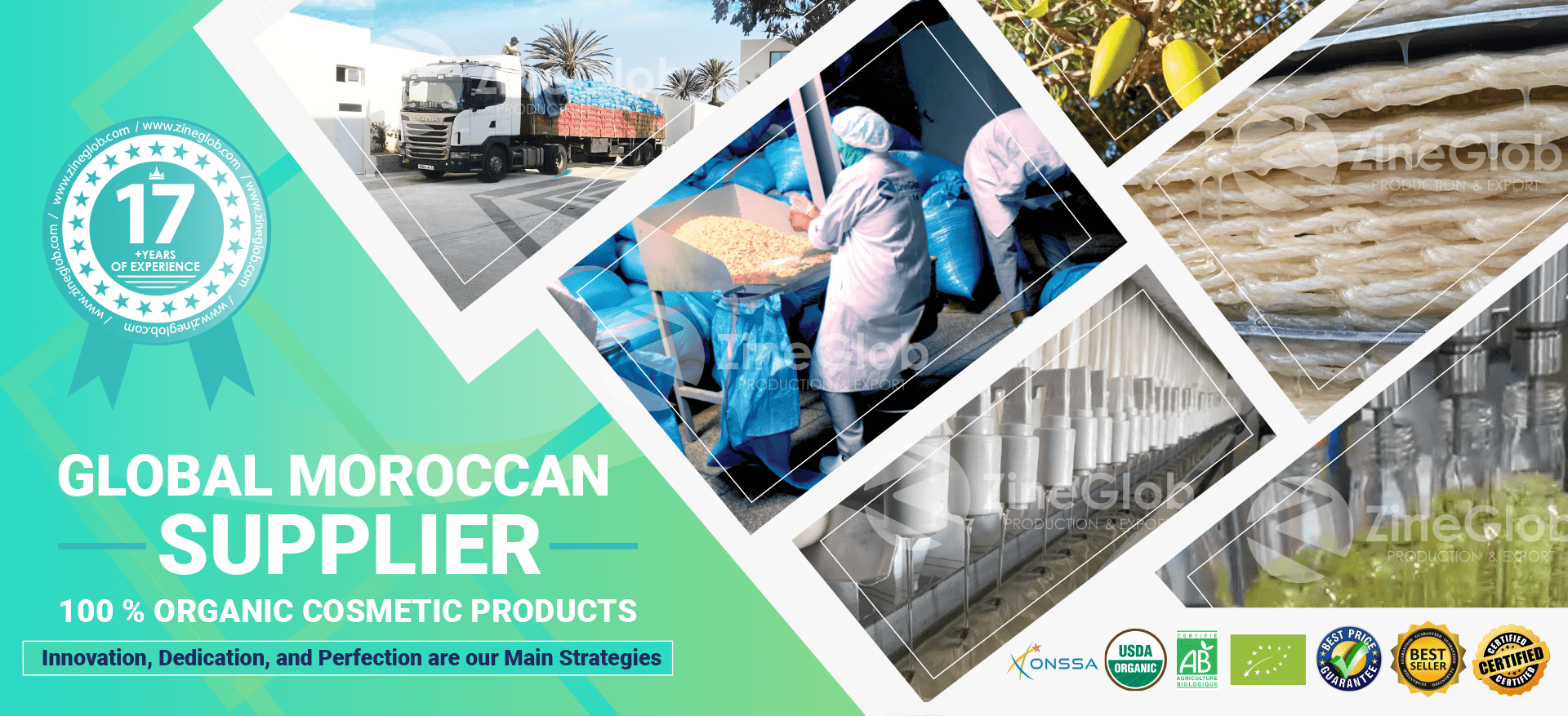 With years of experience in international trade, Zineglob exports organic Argan Oil, Prickly Pear Seed Oil, Rose Water, Black Soap, and other cosmetic products to clients across Europe, America, Asia, Africa, and the Middle East.